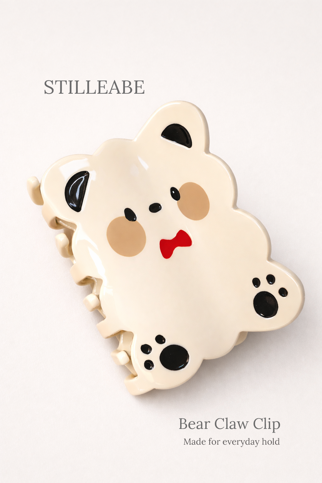 A claw clip, shaped like a cream-colored bear with rounded biscuit-like edges. Made from durable cellulose acetate.