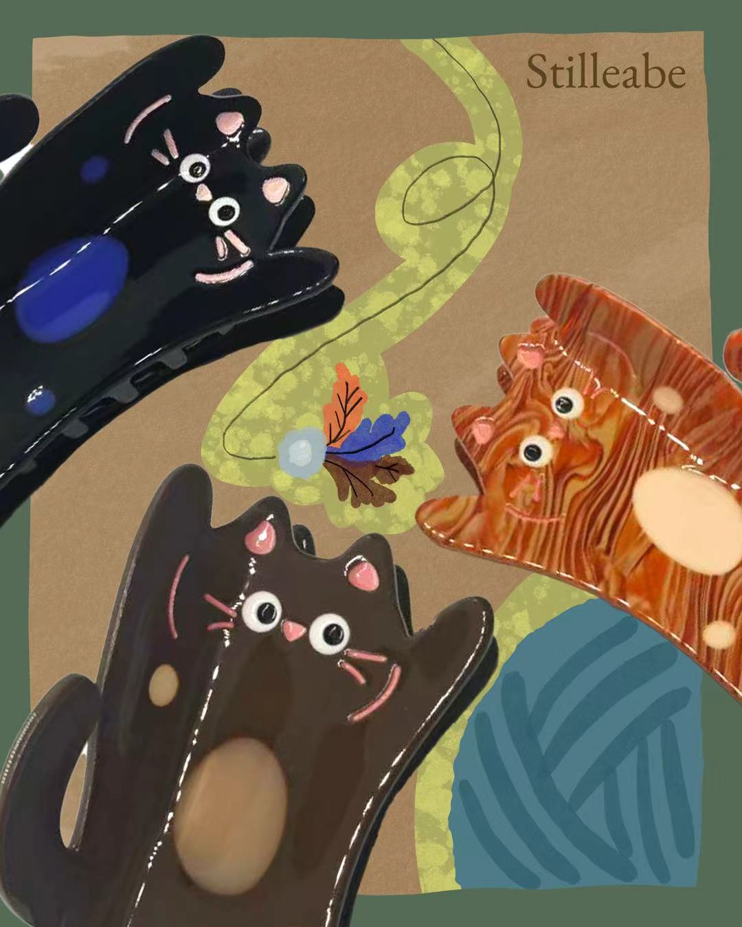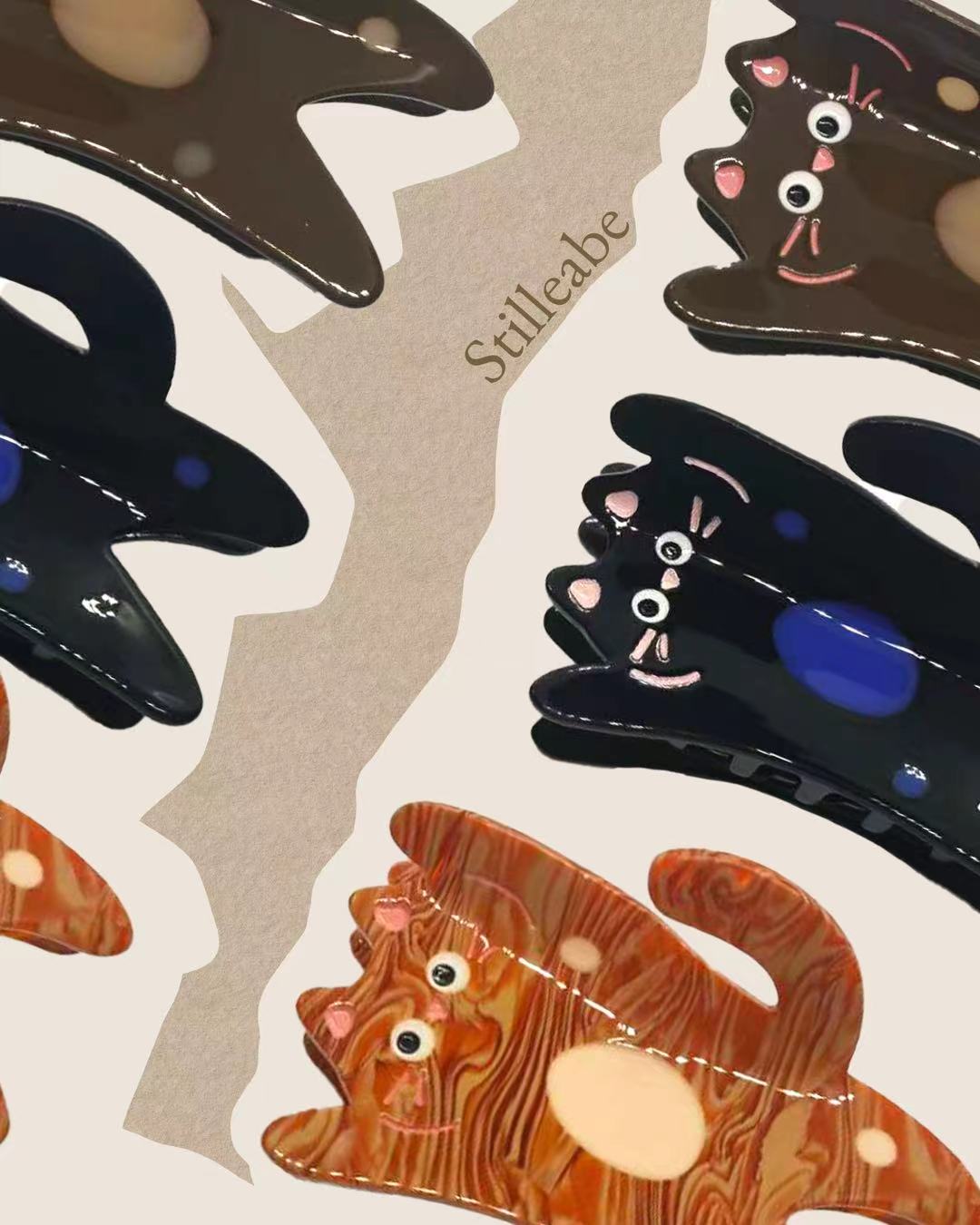 A claw clip, shaped as a cat in stretch position. Made from durable cellulose acetate.